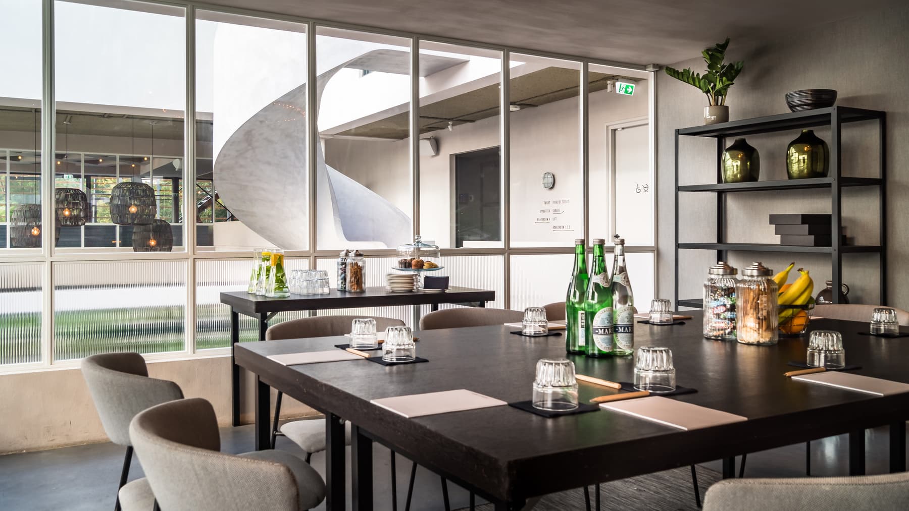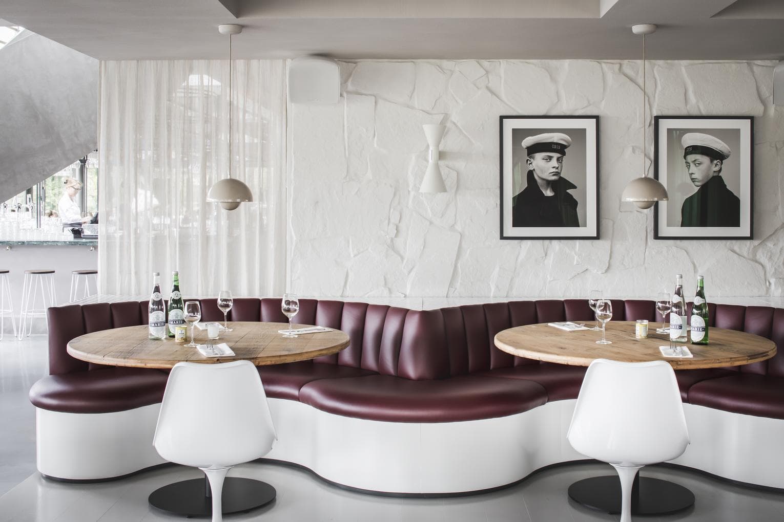 Met grote ramen die uitkijken over de jachthaven. Binnen is het gezellig en kleurrijk. Er is een open keuken met een sushi-bar, veel groene planten, een opvallende groene marmeren bar en een grote trap in het midden.